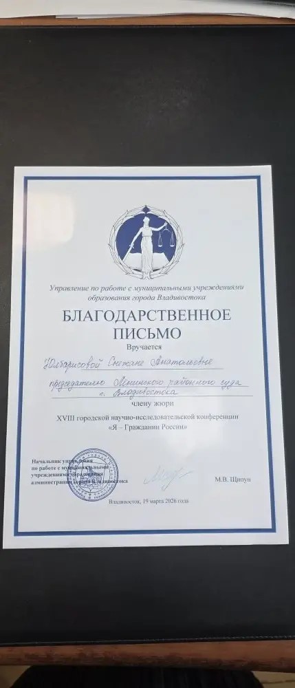 Председатель Ленинского районного суда г.Владивостока Юлбарисова С.А. 19 марта 2026 года приняла участие в качестве председателя жюри Секции № 3 XVIII городской научно-исследовательской конференции школьников «Я – Гражданин России», организованной муниципальным бюджетным общеобразовательным учреждением «Средняя общеобразовательная школа № 2 с углубленным изучением предметов юридического профиля города Владивостока». Участники конференции - ученики 2 – 4, 5 – 8, 9 – 11 классов общеобразовательных учреждений, гимназий, лицеев города Владивостока в рамках соответствующих направлений работы конференции подготовили доклады и рефераты по следующим темам: Ребенок и его права; Участники правовых отношений; Правовая активность несовершеннолетних; Несовершеннолетний как субъект правовых отношений; Право глазами подростка; Предупреждение преступлений и борьба с преступностью; Я живу в Приморском крае; Участие молодежи в политической жизни страны; Юристы на страже прав человека (прошлое, настоящее, будущее); Прокурорский надзор. Антикоррупционная политика. Целями проведения конференция являлись активизация познавательной, интеллектуальной инициативы обучающихся, вовлечения их в исследовательскую деятельность в области правовой науки; выявление одаренных обучающихся в области изучения права; расширение пропаганды правовой культуры среди обучающихся; содействие формирования и развития профессионально-творческой компетентности педагогов и ключевых компетентностей обучающихся: исследовательской, организационной, коммуникативной, информационной; привлечение учащихся к решению актуальных правовых проблем и их практического применения. В рамках работы конференции победители и призёры в каждой секции определены по возрастным категориям, награждены соответствующими дипломами и подарками. Ленинский районный суд г.Владивостока принимает участие в конференции второй год подряд. ![]() |