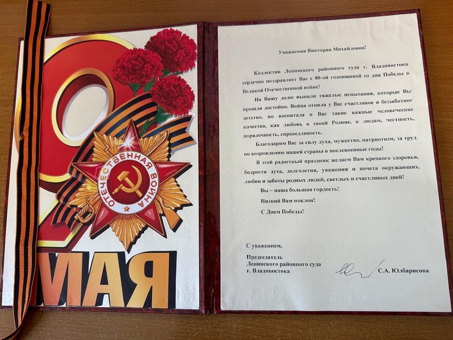 25 апреля 2025 г. председатель Ленинского районного суда г. Владивостока Юлбарисова С.А., помощник председателя суда Бухарова К.Н. и администратор суда Ярош Ж.А. поздравили судью в отставке Малышкину Викторию Михайловну, детство которой пришлось на тяжелую военную пору, с 80-й годовщиной Победы в Великой Отечественной войне. Малышкиной В.М. вручили цветы, памятный подарок и георгиевскую ленточку. Малышкина Виктория Михайловна, 1935 года рождения, работала народным судьей Ленинского районного народного суда г. Владивостока с 15 мая 1979 г. по 29 августа 1989 г. ![]() ![]() ![]() ![]() |