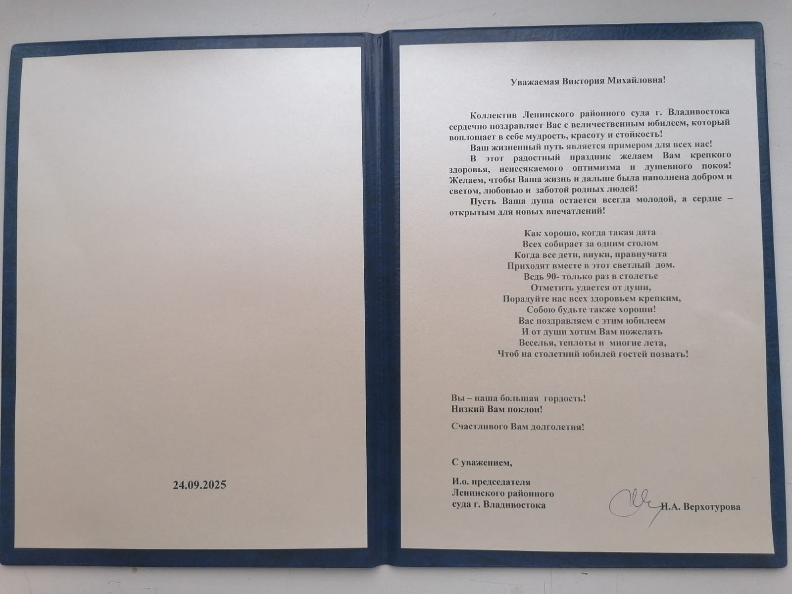 24 сентября 2025 года 90-летний юбилей отмечает Малышкина Виктория Михайловна, судья Ленинского районного суда г. Владивостока, пребывающая в отставке. И.о. председателя Ленинского районного суда г. Владивостока Верхотурова Н.А., судья Ленинского районного суда г. Владивостока Сычева Н.С. и администратор суда Ярош Ж.А. поздравили Малышкину Викторию Михайловну с юбилеем! Жизненный путь Виктории Михайловны является примером для всех работников суда. Родилась Виктория Михайловна в 1935 году в г. Владивостоке. Детство ее пришлось на тяжелую военную пору. Великая Отечественная война началась, когда ей было всего 10 лет. Она много работала. Начала свою трудовую деятельность учителем начальных классов в средней школе № 56, потом работала во Владивостокском городском исполкоме, была депутатом Ленинского района г. Владивостока. Большой вклад внесла Виктория Михайловна и в развитие судебной системы - с 15 мая 1979 г. по 29 августа 1989 г. работала народным судьей Ленинского районного народного суда г. Владивостока, с честью и достоинством исполняла свои обязанности, защищая закон и служа правосудию. Самой большой ценностью в жизни Виктория Михайловна считает свою семью, которая окружает ее любовью и заботой. Поздравление Виктории Михайловны прошло в теплой домашней атмосфере, где она с удовольствием рассказала гостям о своей жизни и вспомнила о самых значимых и ярких ее событиях. Коллектив Ленинского районного суда г. Владивостока пожелал Виктории Михайловне крепкого здоровья, душевного покоя и счастливого долголетия, вручив цветы, поздравительный адрес и подарки. ![]() ![]() ![]() |